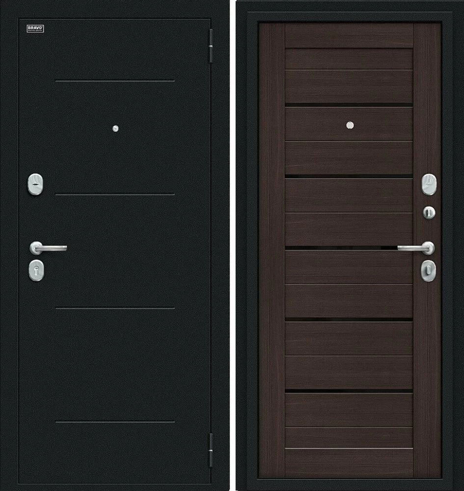 Надежная входная Браво Техно Kale Букле черное/Wenge Veralinga премиум класса по цене 34 213 руб. Большая толщина стали защитит от проникновения в ваш дом, квартиру или коттедж. Используется очень качественная фурнитура: замки, цилиндры, ручки, защелки. Покрытие и отделка двери изготовлено под внимательным контролем производителя. Дверь имеет долгий срок службы и гарантию.